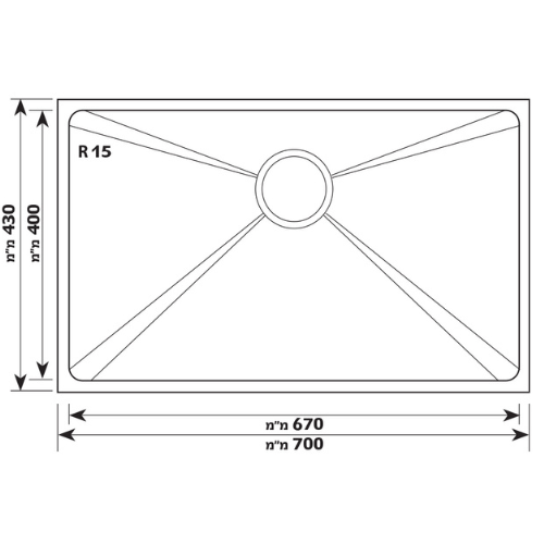 - זוויות פנים הכיור בעל רדיוסים מעודנים 15 מ״מ.